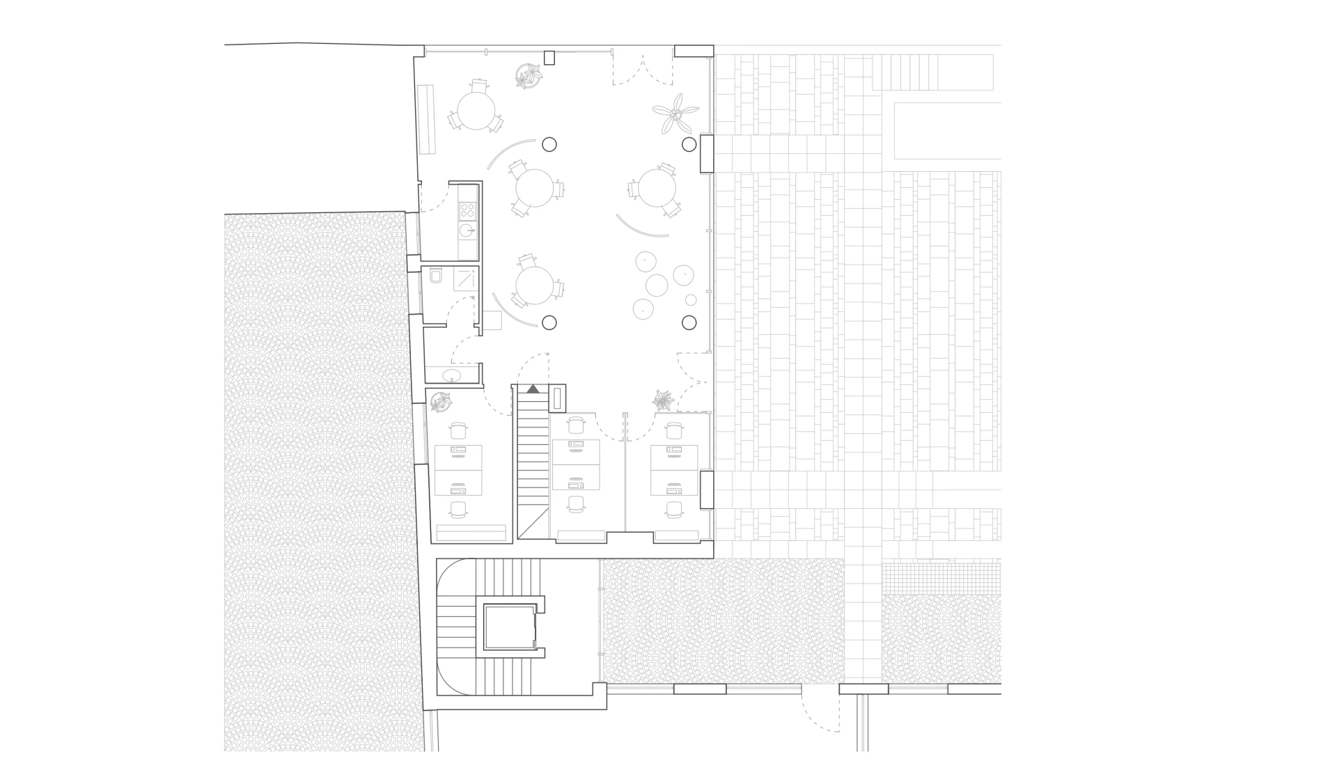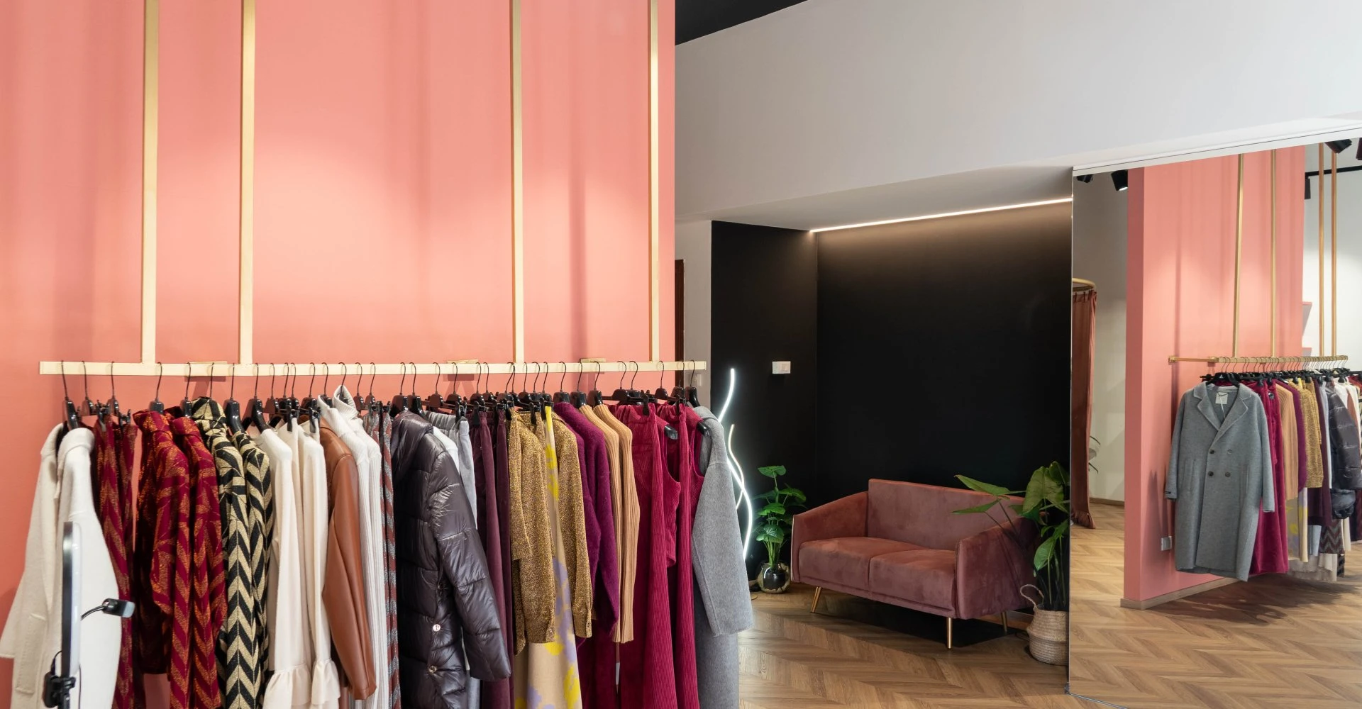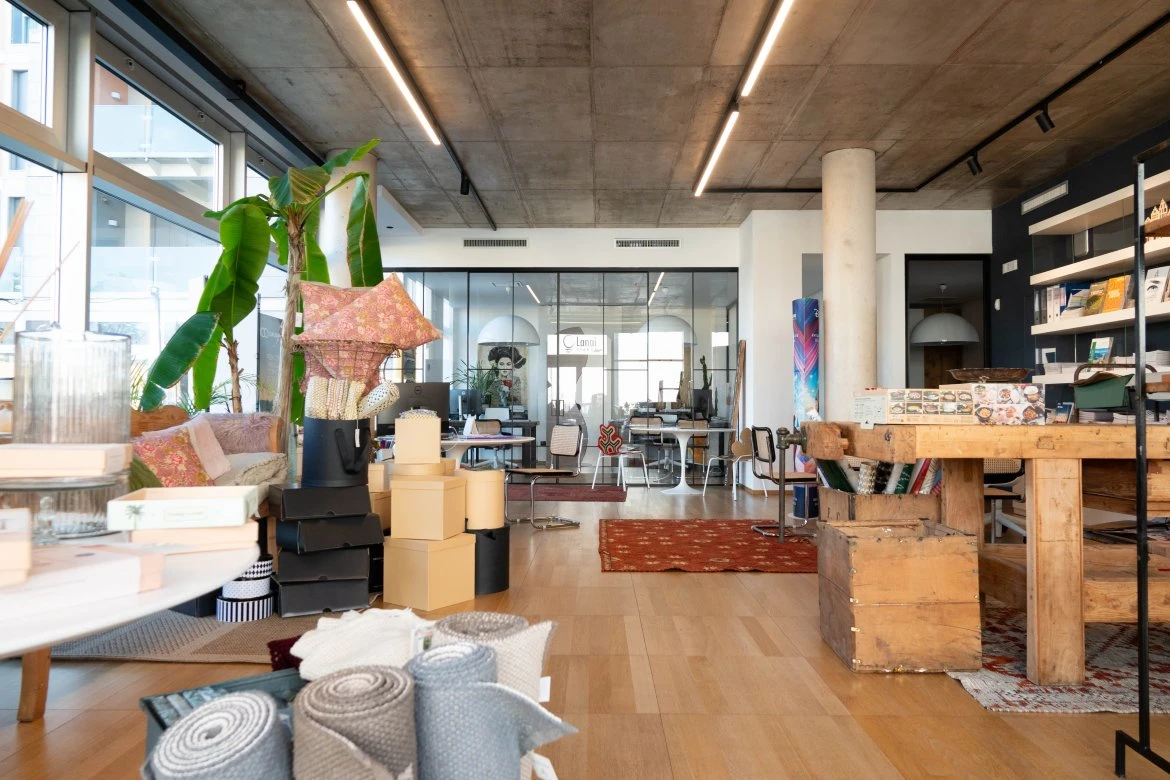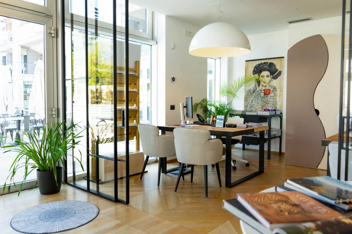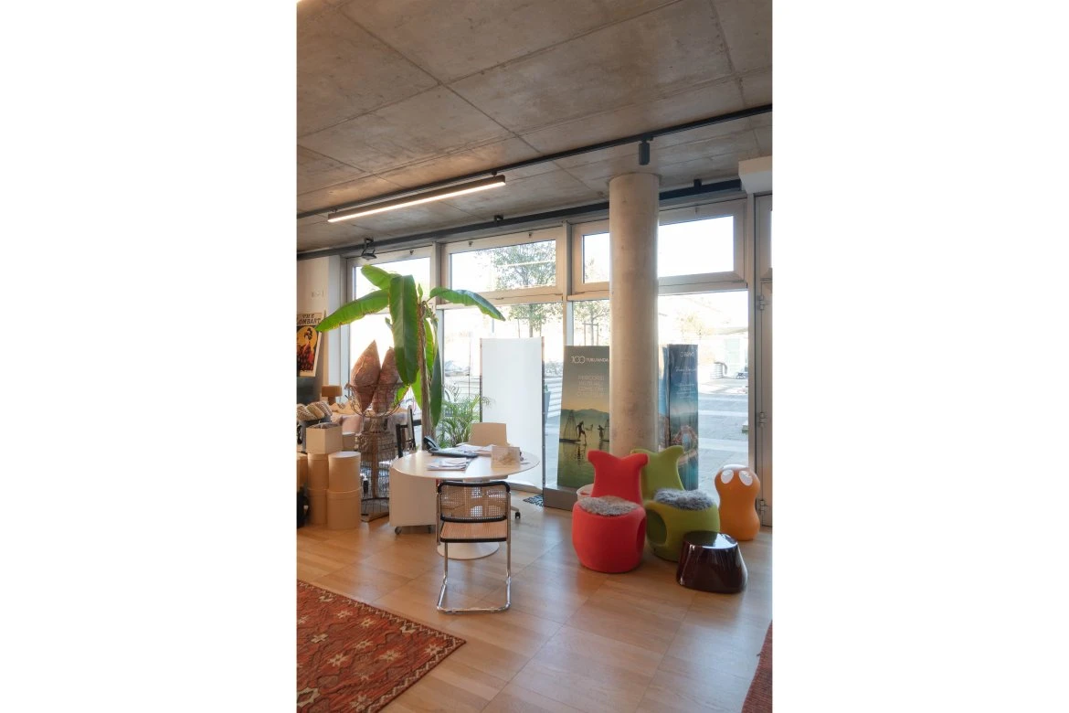Gli spazi interni ospitano uffici operativi e postazioni dedicate all’accoglienza dei clienti, organizzati come un ambiente unitario e fluido. La suddivisione funzionale è affidata a partizioni verticali completamente vetrate, che garantiscono continuità visiva, permeabilità luminosa e un equilibrio calibrato tra privacy e condivisione