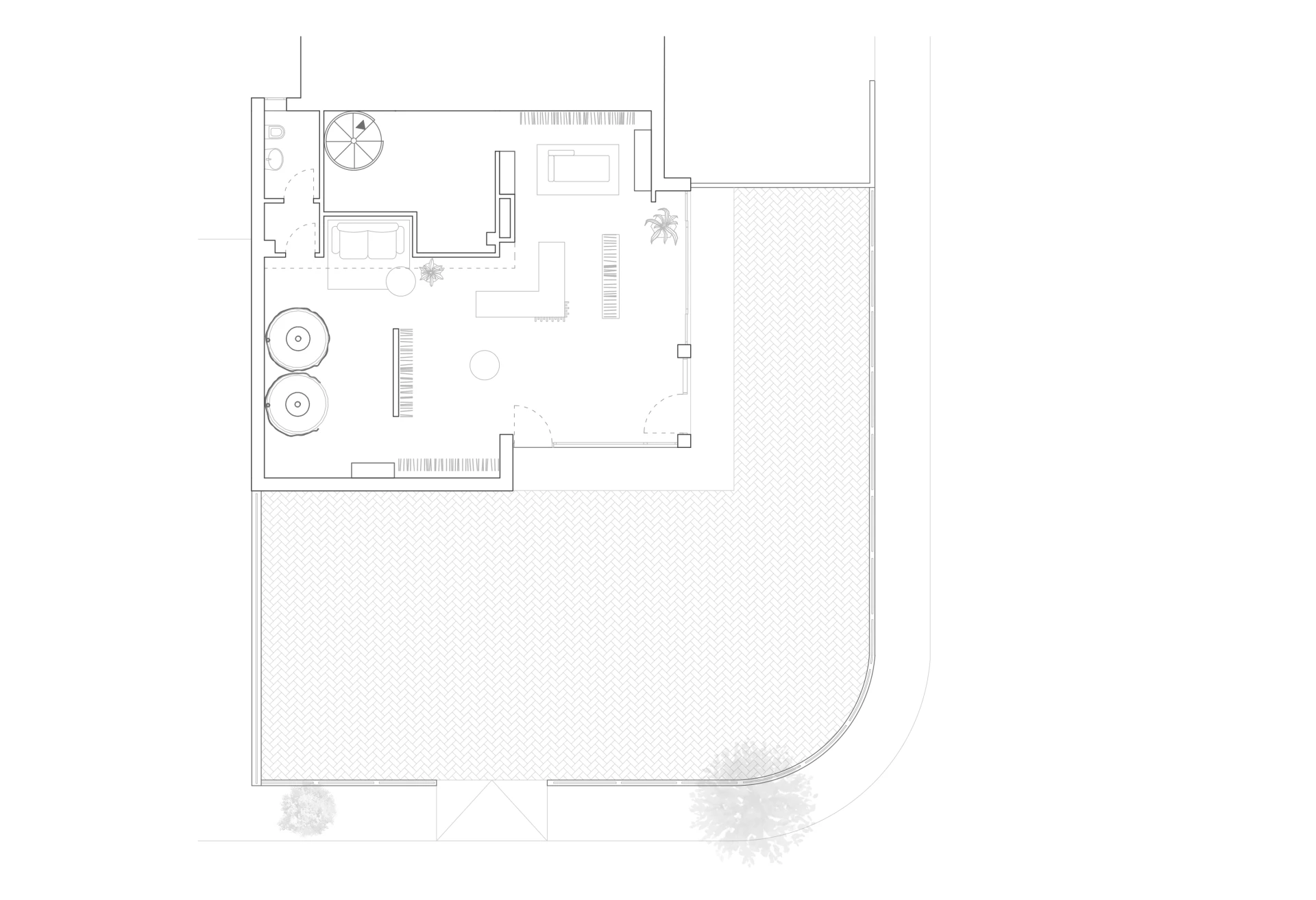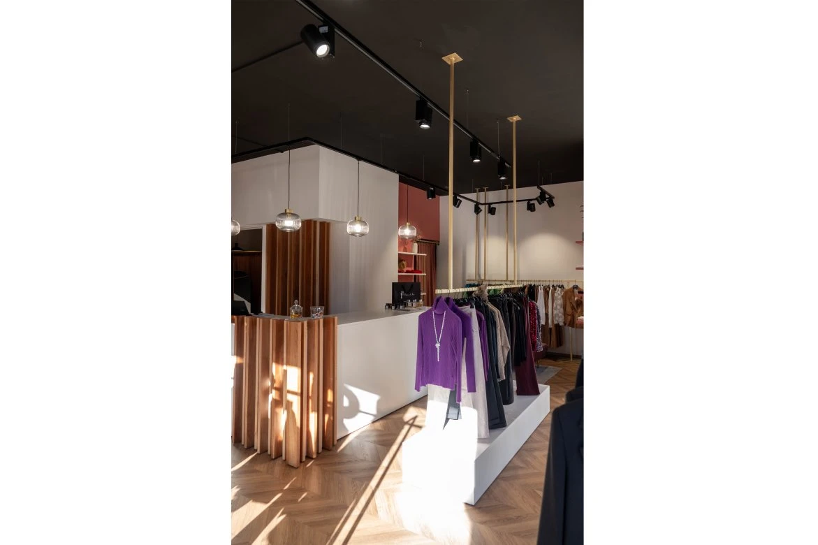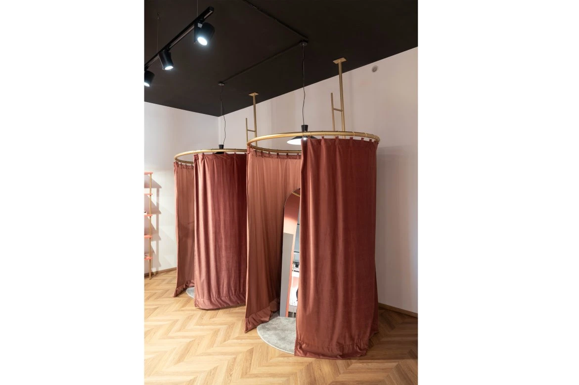 Abbiamo scelto di giocare sui contrasti cromatici e materici per riflettere la duplice anima della donna Âme. Il soffitto nero moderno, colore dell’eleganza per eccellenza, agisce come una quinta scenica che dà profondità e carattere, contrapponendosi al pavimento a spina di pesce. In questo scrigno, gli stand dorati filiformi si muovono come segni grafici leggeri senza mai appesantire lo sguardo. L'elemento poetico del progetto è rappresentato dai camerini circolari avvolti in tendaggi di velluto rosa