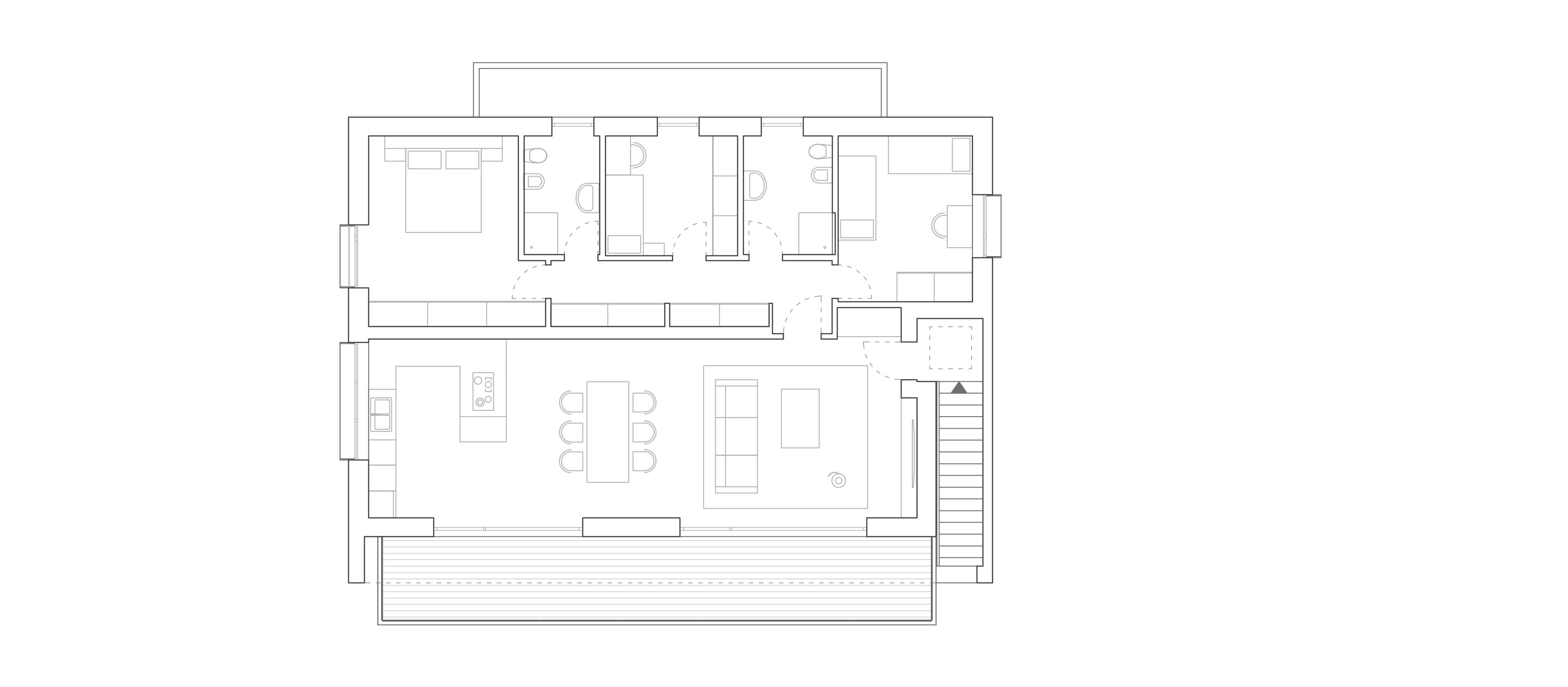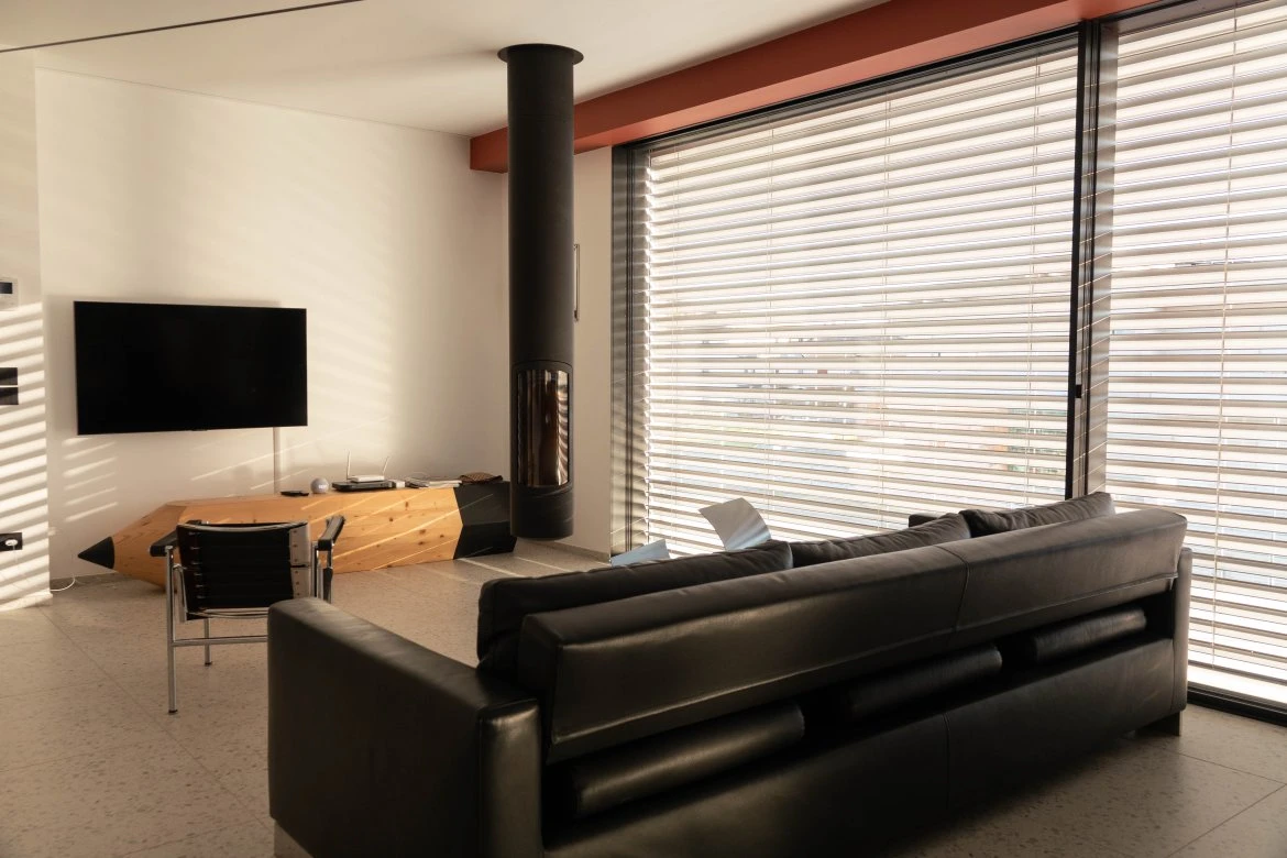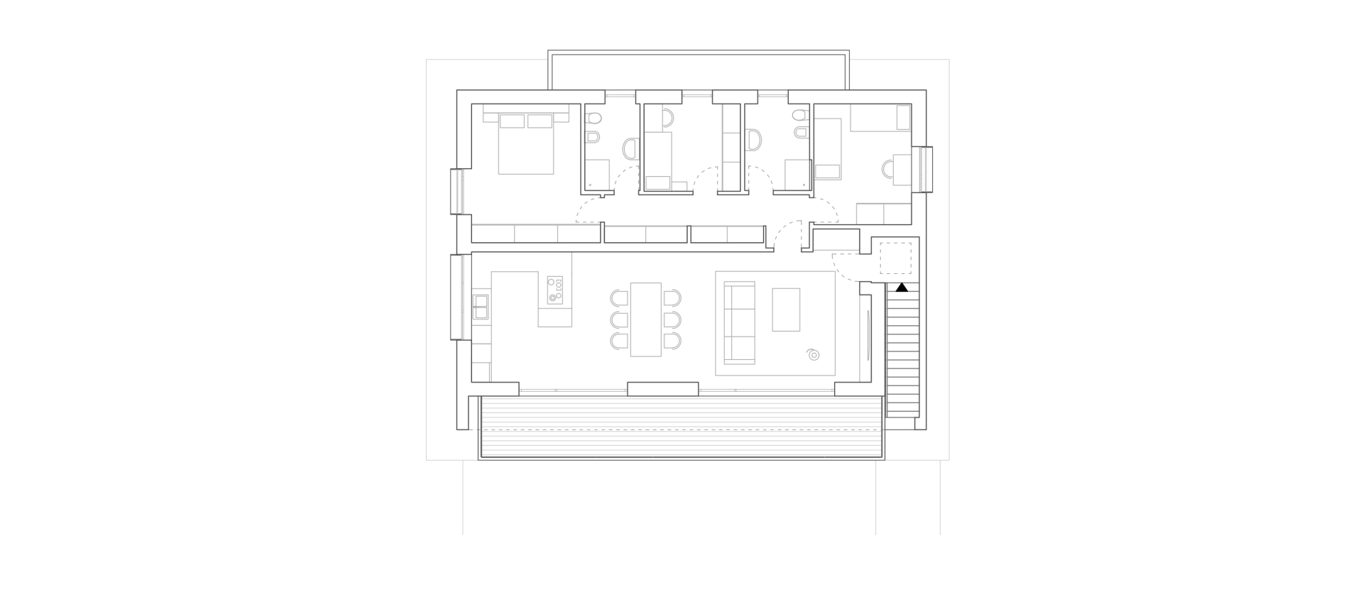 Il piano primo poggia sul volume inferiore ed è definito da un involucro coibentato tinteggiato di colore nero, che ne enfatizza il carattere contemporaneo e il contrasto con la matericità del basamento. In questo livello si sviluppano gli ambienti principali dell’abitazione: la zona giorno si apre verso il terrazzo attraverso ampie vetrate, pensate per amplificare il rapporto tra interno ed esterno e per garantire un’illuminazione naturale profonda e costante durante l’arco della giornata