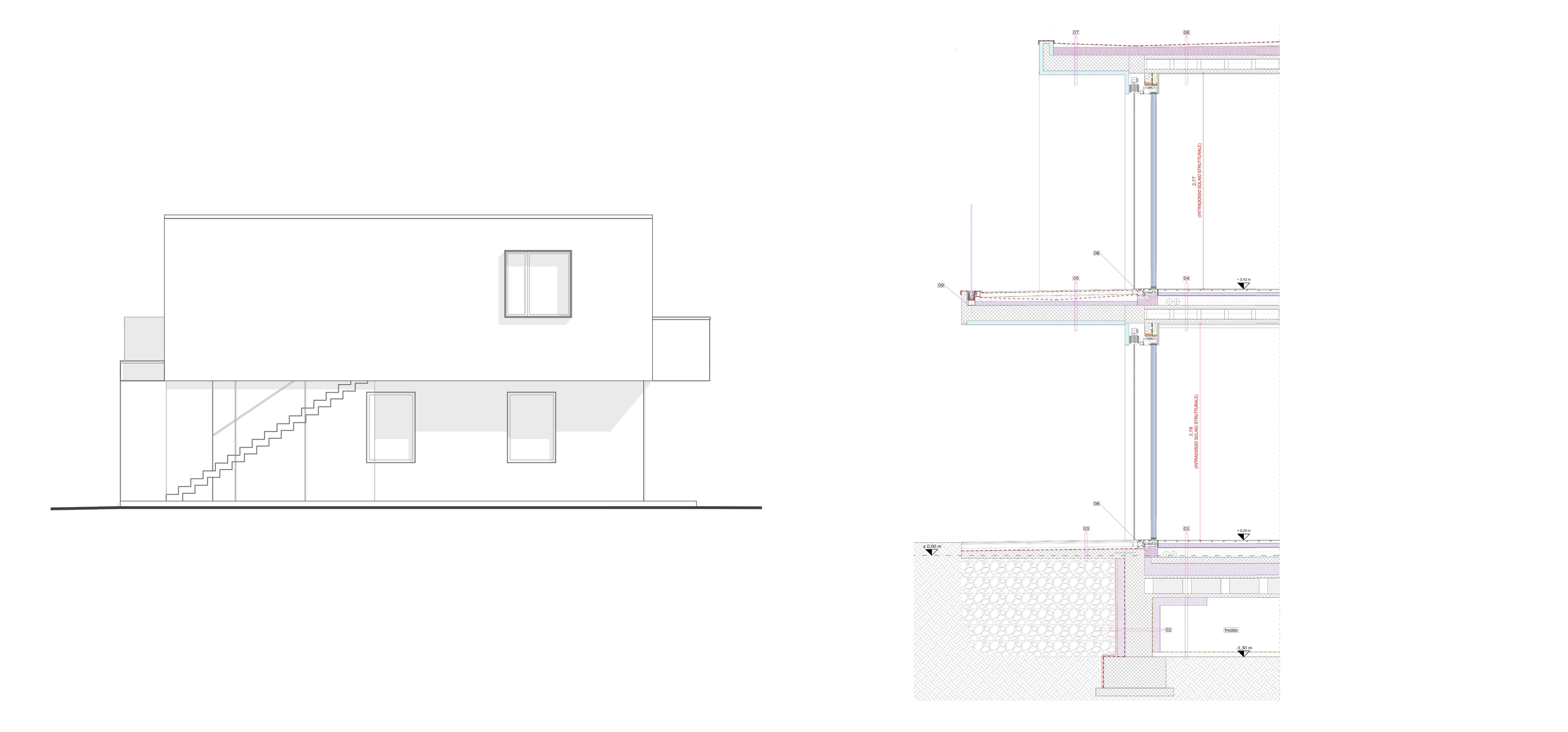 La villa unifamiliare si sviluppa su due piani fuori terra, organizzati secondo una chiara gerarchia funzionale e materica. Il piano terra, realizzato con pareti in cemento faccia a vista, accoglie l’autorimessa, i locali di servizio e uno spazio dedicato alla convivialità. Questo livello si configura come una base solida e introversa, in cui la materia diventa elemento espressivo e strumento di controllo percettivo