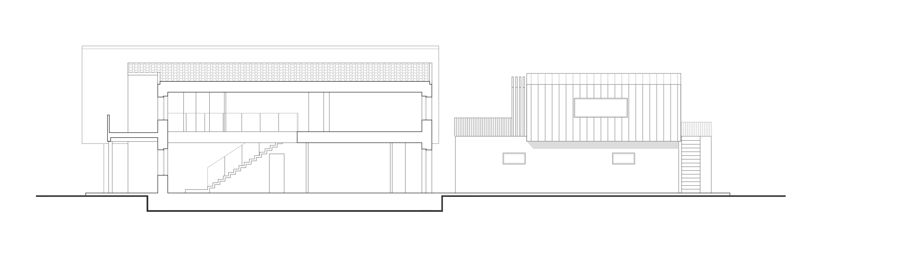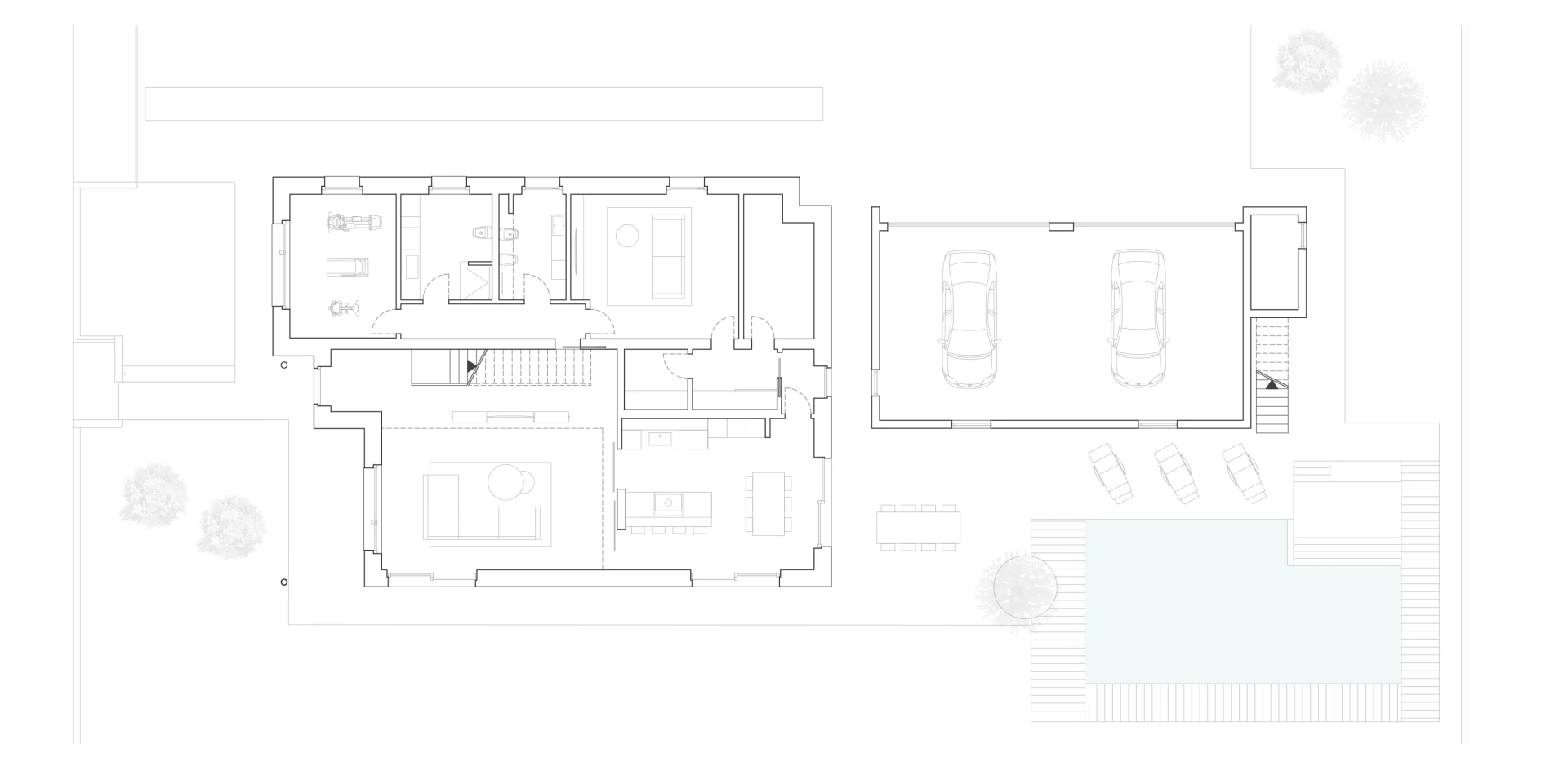 La facciata principale agisce come uno scudo materico che protegge l’intimità domestica, creando quel confine necessario per trasformare il retro in un’esplosione di vita. Il "cannocchiale" al piano primo rappresenta l'elemento poetico del progetto: non un semplice affaccio, ma un dispositivo visivo che proietta lo sguardo verso l'esterno, dove il confine tra "dentro" e "fuori" svanisce